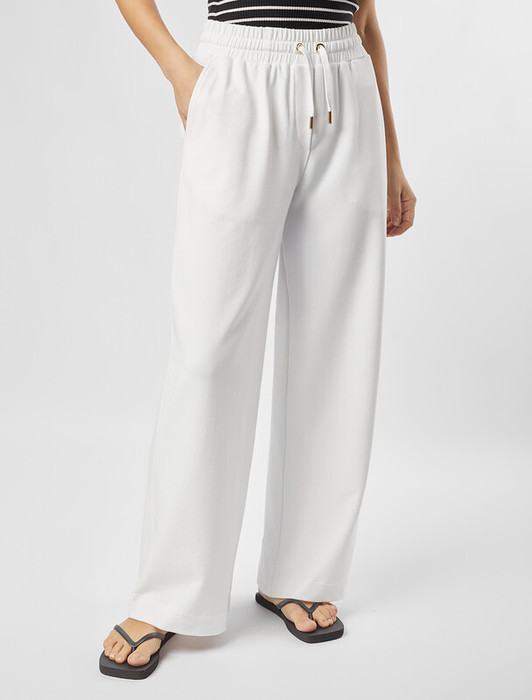 Брюки выполнены из футера двухнитки с эластаном. Модель прямого кроя дополнена боковыми карманами и одним задним карманом. Пояс выполнен из эластичного трикотажа в рубчик. В пояс вставлен плоский хлопковый шнур в тон изделия с серебристыми наконечниками. Изделие дополнено металлическим логотипом бренда. Сочетается в костюме с жакетом D49.078, джемпером D49.079, D49.080 и футболкой D49.081