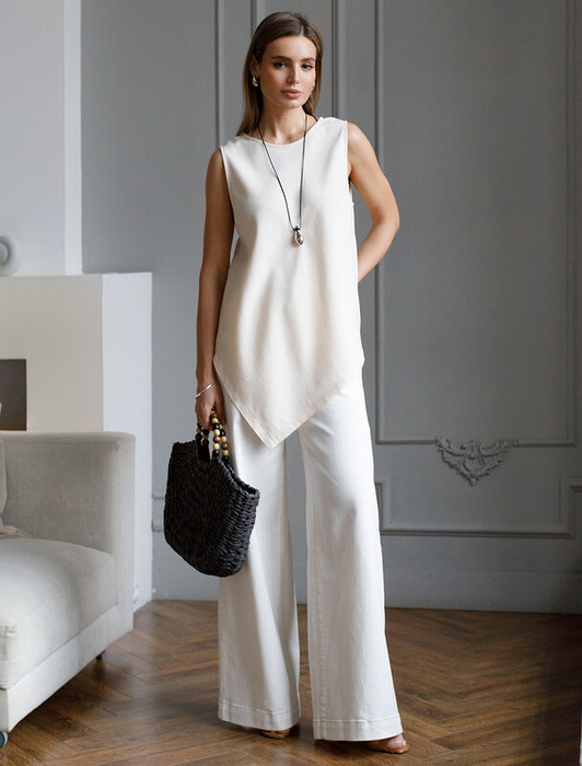 Топ выполнен из плотного лиоцелла. Удлиненная модель с трендовым ассиметричным низом. Ткань изделия отлично держит форму, плавно драпируется и не просвечивает. В теплое время года приятно охлаждает кожу. Добавление синтетических волокон в составе изделия, предотвращает сминаемостьи поддерживает формоустойчивость. Топ сочетается в костюме с брюками D24.261, D24.265, D24.267, юбкой D24.261, шортами D28.057, а также очень эффектно с белыми шортами и джинсами.