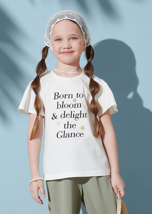 Нежная футболка из 100 % хлопка молочного цвета очаровывает с первого взгляда. Рукав-крылышко придаёт образу воздушность, стильный принт оживляет, а милые цветочки добавляют романтичный акцент.Комфортная и очаровательная-идеальный выбор для юной модницы!