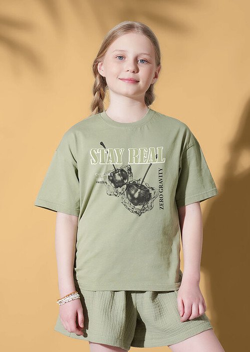 Стильная футболка оверсайз из натурального 100 % хлопка — комфорт и мода в каждом движении. Затяжка на кулиску сбоку позволяет регулировать силуэт, а стильный принт на переде добавляет изюминку. Идеальный вариант для юных модниц!
