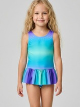 Сплошной купальник в набивку единороги. Узкие контрастные бретели отделаны оборкой. Впереди на подкладе.