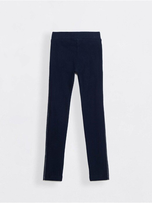 Леггинсы для девочки из трикотажного полотна. По боковым швам отделочная деталь из искусственной кожи SLIM. Верхний срез обработан притачным поясом с эластичной тесьмой внутри. По швам притачивания отделочных деталей по боковым швам, среднему шву передних половинок, шву сиденья задних половинок выполнены двойные отделочные строчки на машине плоского шва с узкой расстановкой игл.