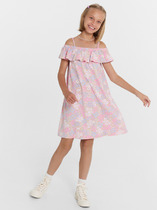 Платье для девочек свободного силуэта на бретелях. По спинке верхнего края платья внутри эластичная тесьма RV20.  Платье отрезное по талии, с кулиской. В ней пробиты петли и протянута эластичная тесьма SFKR-1, с фиксаторами SFFKR-1, образуют сборку. По боковым швам накладные карманы с клапаном. Низ платья обработан швом вподгибку.