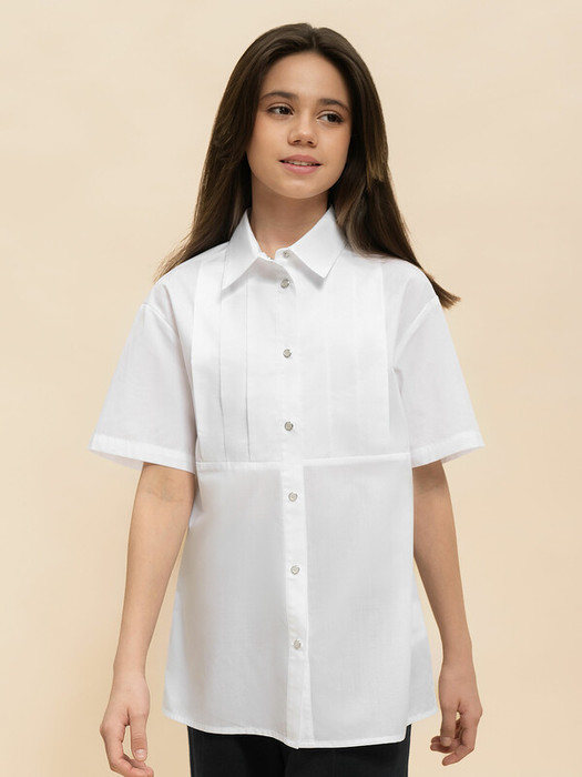 Школьная блузка для девочки свободного кроя. Блузка детская с классическим отложным воротничком. Удобная центральная застёжка на кнопки, имитирующие пуговицы — ребёнок легко и быстро застегнёт и расстегнёт. Фишка модели — глубокие складки, заложенные в верхней части переда. — стильная деталь, выгодно отличающая эту модель от банальных однотонных блузок. В составе ткани преобладает качественный хлопок — блузка в школу для девочки мягкая, воздухопроницаемая и комфортная для ребёнка. Полиэстер помогает не терять форму и отличный внешний вид — изделие прослужит не один сезон. Школьная блузка лаконичного дизайна, без принта, её легко сочетать с различными брюками, юбками, сарафанами. Красивая и практичная блузка белая для девочки — подходит как для повседневной носки, так и для более торжественных случаев. Помните о правильном уходе за изделием: рекомендуется стирать при температуре не выше 30 °C, без предварительного замачивания, с изнанки. Это поможет сохранить качество и цвет блузки на долгое время.
