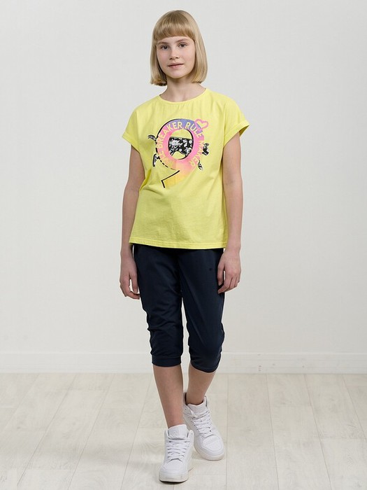 Комплект для девочек футболка и бриджи. Футболка актуального оверсайз силуэта. Спущенная линия плеча, отворот манжета из основной ткани. Стойкий эластичный принт в стиле граффити. Перевод Тот, кто создает правила. Тот, кто нарушает правила. Бриджи расслабленной формы с дополнительной регулировкой объема шнуром и манжетами из основной ткани.