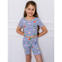 Комплект для девочек футболка и шорты. Футболка свободного объема с открытыми плечами и рукавами воланами. По всей линии груди проходит декоративная трикотажная лента, которая спереди формирует угол. Принт в виде птички колибри и надписи с разноцветным глиттером, перевод Новая атмосфера . Шорты свободного силуэта с защипами спереди и регулировкой объема шнуром.
