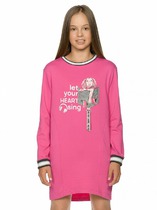 Платье для девочек из футера свободного силуэта со слегка спущенным плечом, зауженное книзу, боковые швы переведены на перед, перепад длины переда и спинки, рукав умеренного объема, горловина и манжеты рукавов из рибаны с люрексом. Мягкий эластичный принт с серебряным блеском. Перевод Позволь своему сердцу петь и Музыка сердца.
