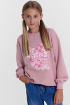 Джемпер свободного силуэта. Рукава длинные, втачные. Линия плеча спущена. Перед и спинка цельнокроеные. Горловина круглой формы. В горловину втачан вязаный воротник, шов втачивания закрыт бейкой из полотна трикотажного кулирного. По низу рукавов притачены манжеты из рибаны. Низ изделия обработан швом в подгибку.