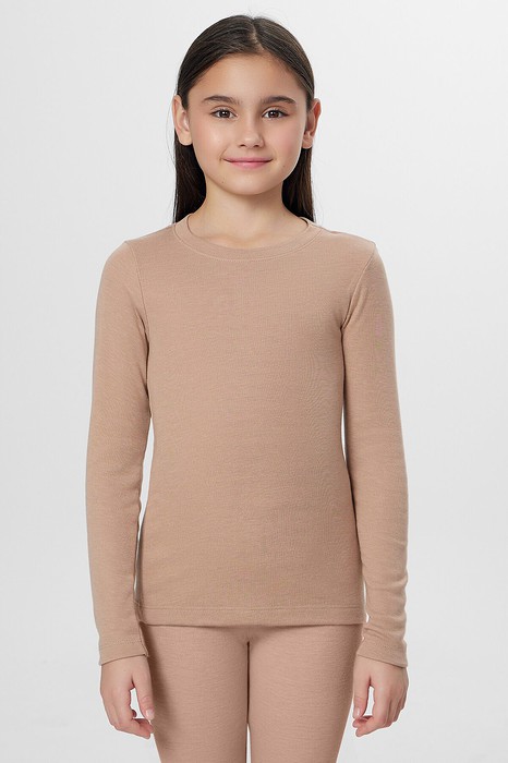 Джемпер "термо" для девочек прилегающего силуэта, длиной до линии бедер. Рукав втачной длинный. Горловина округлой формы, с обтачкой из основного полотна. По шву втачивания обтачки проложена отделочная строчка. Низ джемпера и рукавов обработан швом вподгибку на 2х игольной плоскошовной машине.