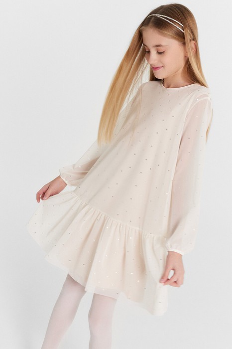 Нарядное платье А-образного силуэта для девочек. Изготовлено из полупрозрачной воздушной сетки с подкладкой из хлопковой кулирки. Вырез круглый, классический. На спинке застегивается на пуговицу. Рукава объемные, длинные. Отличный вариант для утренников и праздников!
