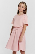 Платье свободного силуэта. Горловина круглой формы обработана обтачкой из рибаны. Шов притачивания рибаны распошит. Рукава длинные, втачные, внизу на сборке. Линия плеча спущена. По низу рукавов притачные манжеты из рибаны. Центральный шов по спинке с разрезом снизу. Низ изделия обработан на 2-х игольной плоскошовной машине швом в подгибку. Длина платья выше колена.