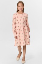 Платье для девочек свободного силуэта. Рукава втачные длинные, с отрезными манжетами из рибаны. Плечо слегка спущено. Горловина округлый формы с обтачкой из рибаны. Низ изделия обработан рибаной .