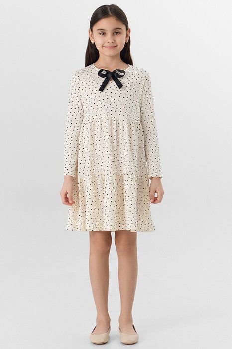 Платье полуприлегающего силуэта. Горловина круглой формы, обтачка из основного полотна. В центре горловины декоративный вырез с приточной лентой 2 см. Рукава втачные длинные. Платье с двумя отрезными воланами по переду и спинке. Низ изделия и рукавов обработаны швом в подгибку на 2-х игольной плоскошовной машине.