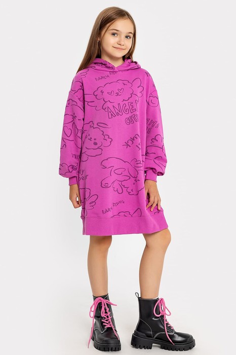 F3-132.01.300, футер 3ех нитка, 87% хлопок, 13% полиэстр, 300 гр, 185см / R22-062.01.360, рибана 2*2, 94% хлопок, 6% эластан, 360 гр, 110см Платье свободного силуэта с капюшоном. Рукава длинные, втачные. Линия плеча спущена. Перед и спинка цельнокроенные. Горловина круглой формы. Подкладка капюшона из основного полотна. По низу рукавов и изделия притачены манжеты и пояс из рибаны.
