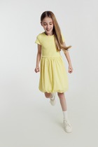 Платье А-силуэта с отрезными воланами. Треугольный вырез горловины обработан бейкой из основного полотна в чистый край. Короткие рукава-крылышки покроя реглан. Низ лифа фигурный. По переду лифа пришиты три пуговицы в качестве декора. Низ изделия и рукавов обработаны швом вподгибку.