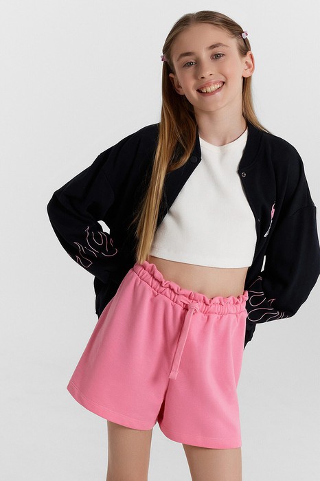Свободные шорты для девочек, выполненные из трикотажного футера. Пояс с эластичной тесьмой внутри и регулировочным шнурком-завязкой. Рекомендуем!