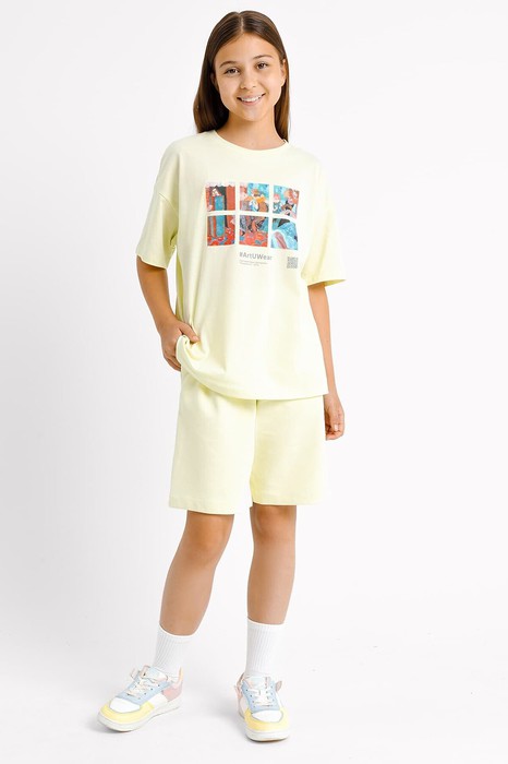 Шорты свободного силуэта для девочек. Выполнены из футера – мягкого, гигроскопичного и неприхотливого трикотажного полотна. Футер тонкий, без подчеса. Длина до колена. Боковые карманы добавляют практичности. Регулировать ширину по талии можно с помощью шнурка-завязки.
