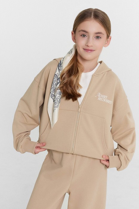Толстовка для девочек прямого силуэта с капюшоном. Капюшон на подкладке из основного полотна. Шов втачивания капюшона закрыт х/б тесьмой. Рукава втачные, линия плеча спущена. Притачные манжеты по низу рукавов и притачной пояс из рибаны. По переду застежка молния, карман кенгуру.