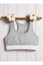 Топ для девочек из рибаны, облегающего силуэта, длиной ниже уровня талии. Перед и спинка цельнокроеные. Горловина круглая. Горловина и проймы окантованы широкой бейкой из основного полотна. Низ изделия обработан швом вподгибку.