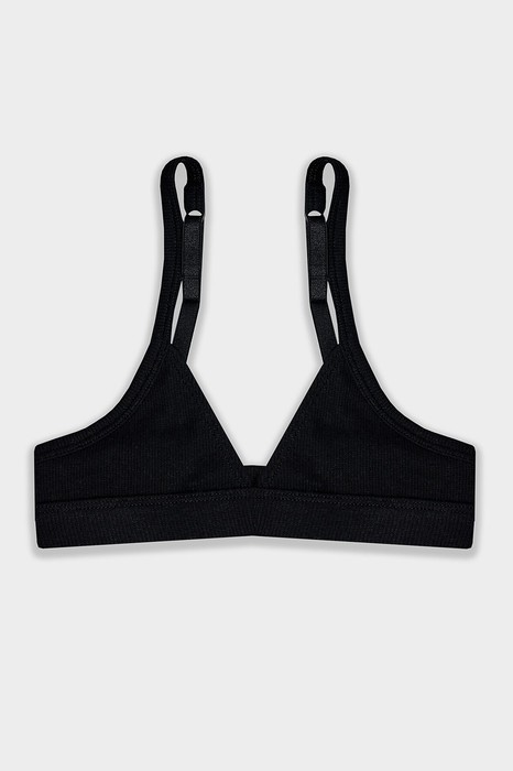 Топ прилегающего силуэта, без каркаса. Чашки без выточек с подкладкой из кулирного полотна SJ-6 (SJ-009.01.170), 95% хлопок; 5% эластан, 180 см, 170 гр/м?. По верхнему краю чашки с изнаночной стороны в подгибке эластичная тесьмавнутри (жилка тканая WT4-6) ширина -6 мм. Верхний срез спинки и проймы окантован бейками из основного полотная с эластичной тесьмой внутри (жилка тканая WT4-10) ширина 10 мм. Бретели SWE3-10, ширина 10 мм. На бретелях: кольца и регуляторы. Низ топа окантован бейкой из основным полотном с эластичной тесьмой внутри (внутренняя резина 25RV) ширина -25мм.