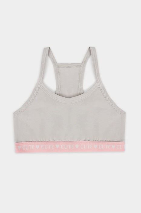 Бюстье из трикотажной кулирки. Горловина округлой формы. Спинка фигурная, как в спортивном топе. Все срезы окантованы бейкой из основного полотна. По нижнему срезу настрочена жаккардовая эластичная тесьма.