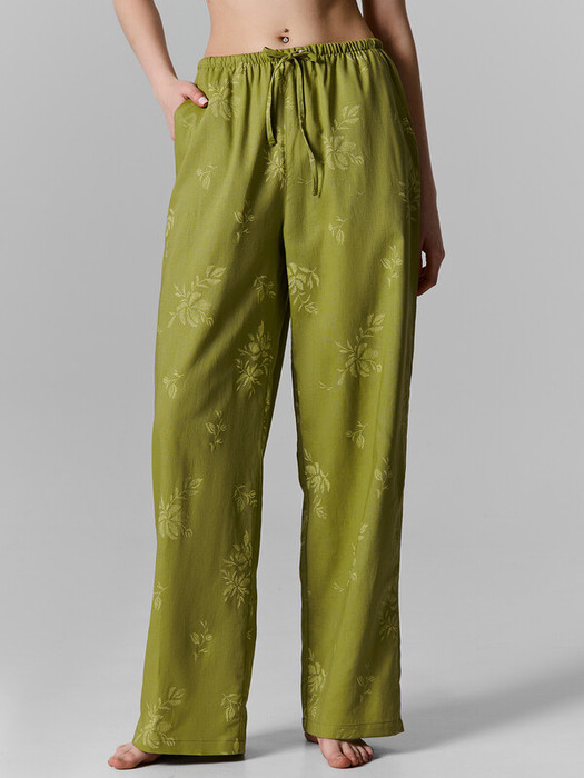 Брюки с посадкой на талии свободного силуэта. Пояс цельнокроеный с резиной внутри. По центру пояса пробиты петли, протянута бейка из основного полотна. На передних деталях карманы "хулиганы".   Низ изделия застрочен швом в подгибку.