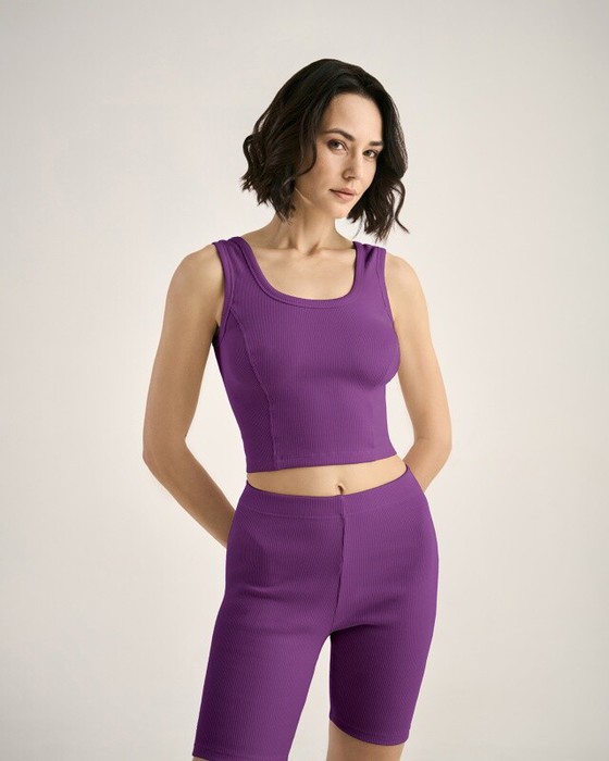 Майка из кашкорсе, облегающая с отстроченными рельефами. Горловина и проймы окантованы основной тканью