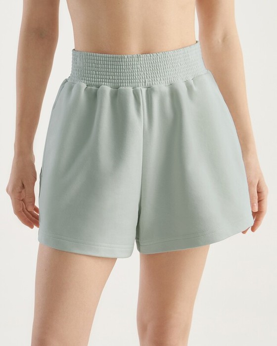 Шорты расклешенные книзу, высокая талия. Пояс из основной ткани, отстроченный