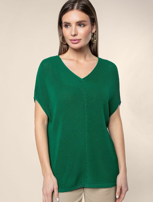 Джемпер фактурной вязки из пряжи на основе крученой вискозы с лиоцеллом. Спущенная линия плеч подчеркивает расслабленный и непринужденный стиль. Шелковистое но достаточно плотное изделие, приятно ощущается на теле, поэтому в нем будет комфортно даже на голое тело в жаркое время года.