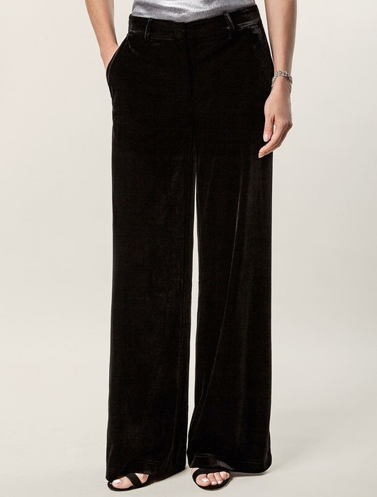 Брюки прямого кроя выполнены из мягкого эластичного бархата. Модель черного цвета с посадкой чуть ниже талии дополнена удобными боковыми карманами и шлевками на поясе. Кроме вечернего наряда с сияющим верхом и босоножками, также можно создать повседневный образ с рубашкой, лонгсливом, футболкой, жакетом и лоферами.
