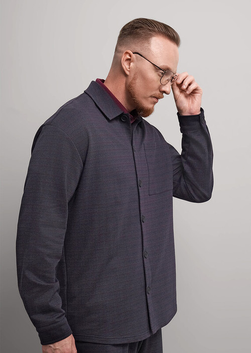 Мужская куртка-рубашка выполнена из трикотажного полотна, свободного силуэта с отложным воротником и застежкой на пуговицы. Модель дополнена нагрудным карманом и имиджевой фурнитурой. По низу рукава манжета. Отлично подойдет для работы и учебы.