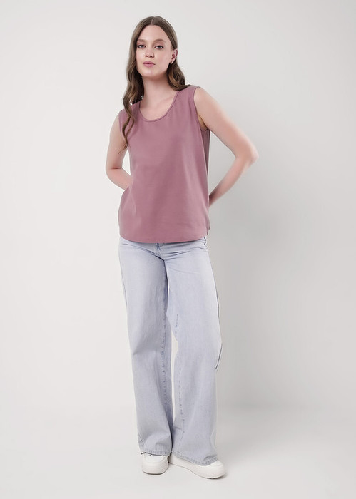 Майка из трикотажного полотна - рибана. Умеренный объем. Широкая бретель,округлая горловина. По пройме и горловине окантовка.