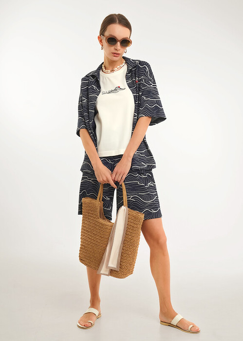 Рубашка из трикотажного полотна пике, втачной короткий рукав. Отложной воротник со стойкой, По борту цельнокроеная планка с застежкой на пуговицы. Боковые разрезы. По переду принт.