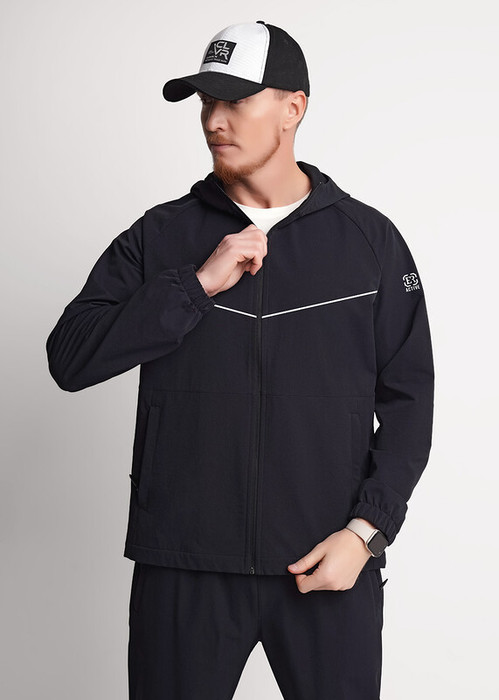 Мужская куртка выполнена из плащёвки на трикотажной основе с капюшоном и молнией, боковыми карманами и манжетами на резинке. Модель дополнена светоотражающим имиджевым принтом для безопасности и стиля. Отличный вариант для города и активного отдыха