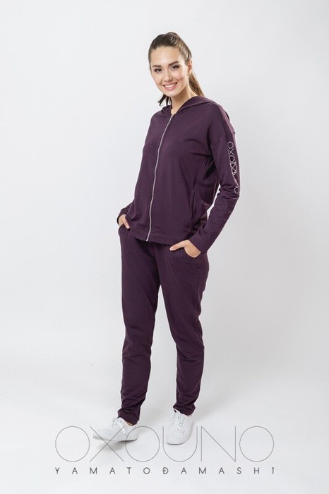 Толстовка на молнии с капюшоном, с отрезными бочками по переду и спинке, карман в шве рельефа. Декор стразы.Свободные брюки, два кармана на передних половинках брюк, без манжет, пояс из кашкорсе. Декор отстрочка по карманам, вышивка.