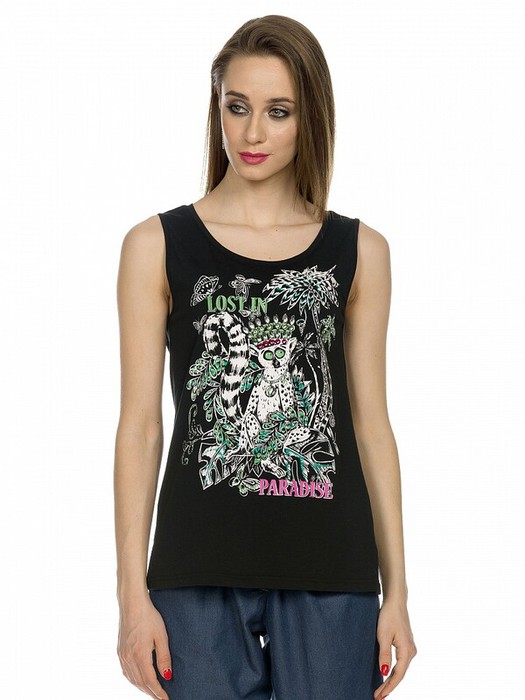 Майка женская. Удлиненная майка с небольшими разрезами по боковым швам. Стойкий мягкий принт выполнен с добавлением неоновых красок и декорирован стразами. Перевод Потерявшийся в раю.
