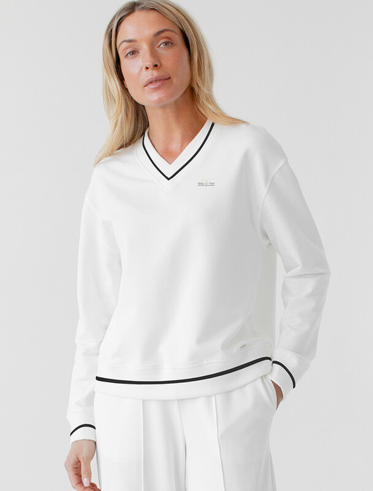 Перевод принта: Теннисный клуб. Джемпер умеренного объема с V-вырезом выполнен из эластичного футера двухнитки. Горловина, манжеты и пояс выполнены из эластичного хлопка с контрастной полосой. Изделие дополнено золотистым логотипом бренда. Сочетается в костюме с брюками D44.141, D44.142, шортами D48.009 и юбкой-шортами D46.041