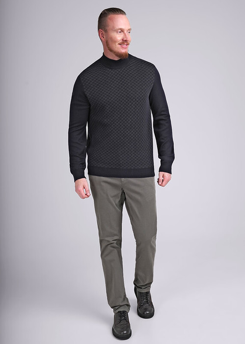 Мужская водолазка с воротником-стойкой и длинным рукавом. Выполнена из смесовой пряжи с большим содержанием хлопка. Модель с геометрическим орнаментом по переду, подходит для формальных и повседневных встреч.
