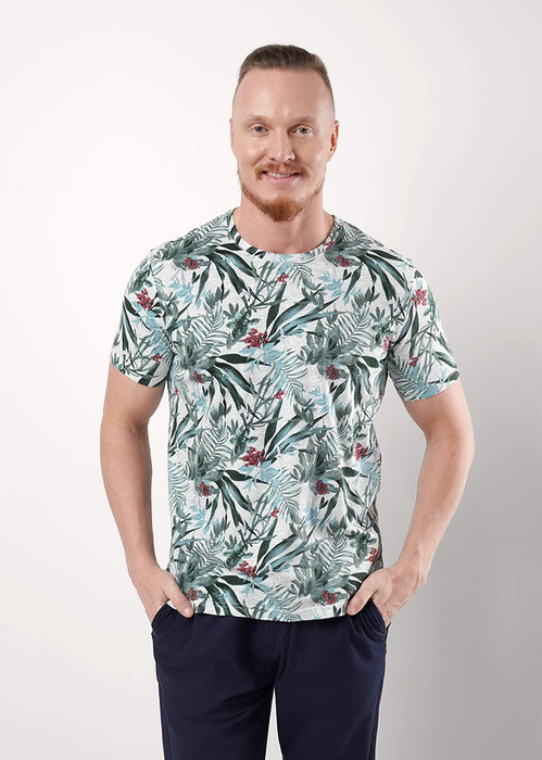 Футболка мужская с круглым вырезом горловины и коротким втачным рукавом из фактурного полотна ""флам"" с растительной набивкой. Футболку дополняет имиджевая фурнитура. Подойдет для прогулок с друзьями.