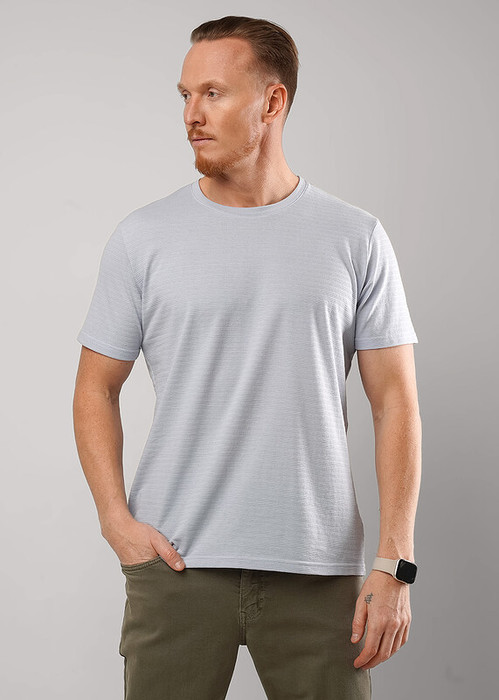 Футболка мужская из фактурного полотна, с содержанием хлопка и полиэстера. С круглым вырезом горловины и коротким втачным рукавом. Оригинальность изделию придает дизайнерская нашивка