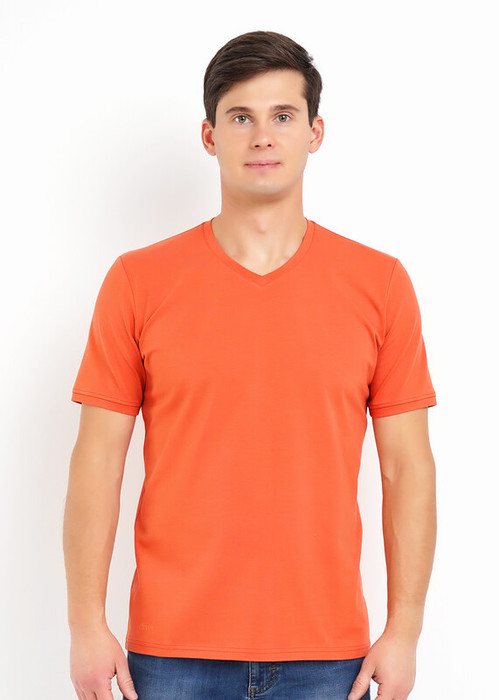 Базовая однотонная футболка стандартного объема с V вырезом горловины, втачным рукавом из хлопкового полотна с добавлением эластана. Является неотъемлемой частью мужского гардероба.
