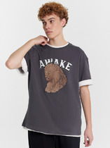 Фуфайка с коротким рукавом среднего объема, круглым вырезом горловины, которая оформлена обтачкой из рибаны, выполненная из набивного полотна.