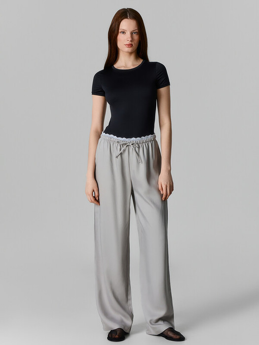 Брюки прямые свободные, посадка средня. Пояс цельнокроеный с эластичной тесьмой внутри (внутр. 20RV). С внешней стороны пояса пробиты петли и вставлен шнур-бейка из основного полотна. По верхнему срезу отделка из кружева 2.4см (L156-2.4, арт. JS00017-2.4). Брюки с боковыми швами. Нижние срезы обработаны швом вподгибку с закрытым срезом.