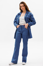 Брюки женские прямого силуэта из ткани. На деталях переда карманы с отрезным бочком. Пояс отрезной состоит из двух частей, задняя часть пояса присборена на резинку. Посадка средняя.