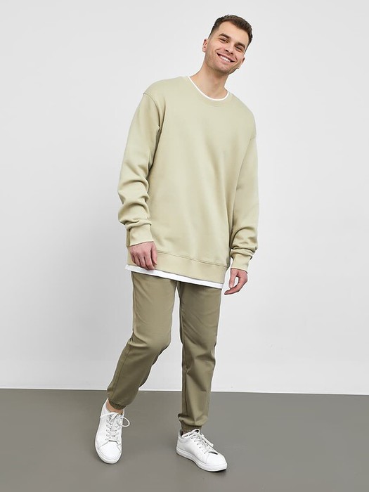 Джемпер прямого силуэта из трикотажного футера с теплым подчесом. Круглый вырез горловины окантован декоративной деталью из кулирки, как и нижний край – словно под джемпер поддета футболка. Рукава длинные, с манжетами. Стильный повседневный вариант