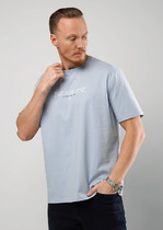 Синяя мужская футболка с надписью «Good times» («Хорошие времена») создана для тех, кто ценит стиль и комфорт. Модель оверсайз со спущенной линией плеча и короткими рукавами легко сочетается с любым низом.