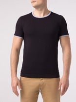 Нижние срезы футболки и рукавов обработаны швом вподгибку.