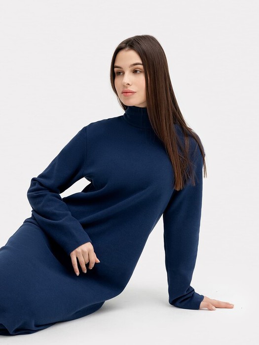 Платье прямого силуэта из трикотажного полотна селаник. Горловина круглой формы с воротником-стойкой. На детали спинки центральная застежка на потайную молнию и обработан разрез. На детали переда вытачки от бокового шва. Рукав втачной длинный.