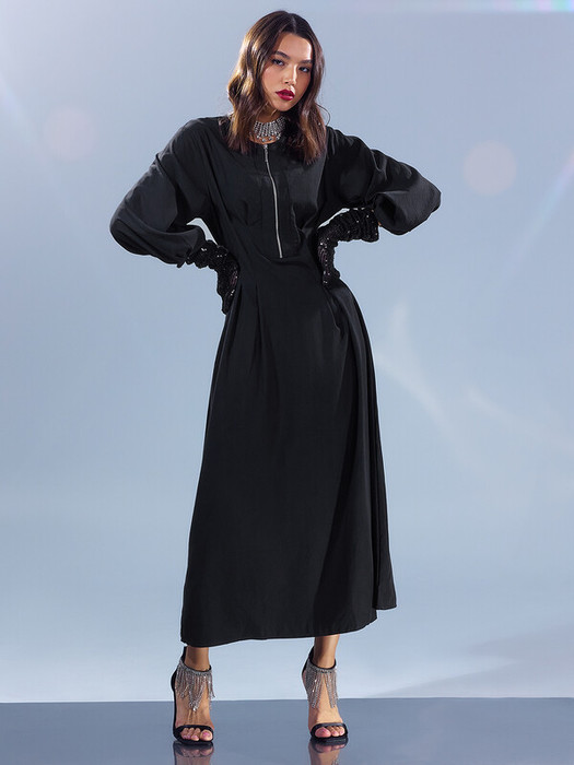 Рукав втачной, длиной 3/4. По низу рукава заложены складки для создания обьема. Перед платья с застрочеными складками.