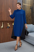 Платье прямое, свободное. Длина мини. Горловина с цельнокроеной стойкой. Рукава втачные длинные. Плечо спущено. Спинка со средним швом. Нижние срезы обработан швом вподгибку.